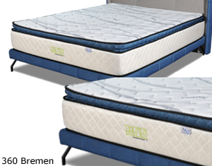 360 Bremen* Thickness :12" * Spring : Inner Spring * Comfort Layer : HD Foam Pillow Top * Comfort Fabric : Cool Max * Bridge Layer : Coconut Fibre * Edge Support : Enhanced Single : Super Single : Queen : King : |