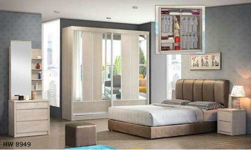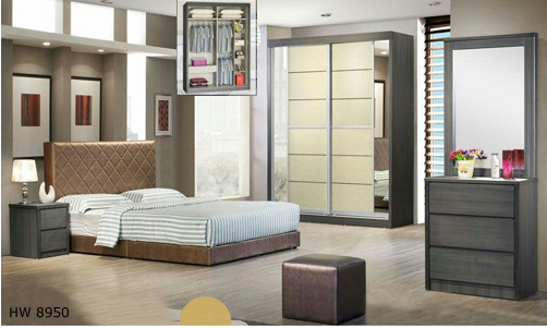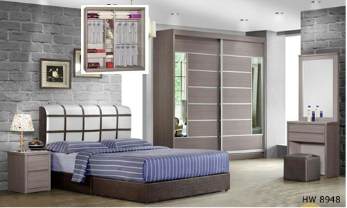 ![]() HW 8950 Queen - H41.5" x D80" x W60" Dressing Table - H73.5" x D15.5" x W28" Side Table - H19.5" x D15.5" x W15.5" Wardrobe 6' - H95" x D24" x W72" Wardrobe 5' - RM 2,969 Set Wardrobe 6' - RM 3,169 Set Wardrobe 8' - RM 3,369 Set |