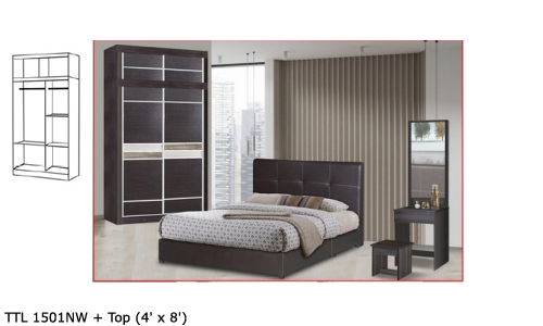 ![]() TTL 1502NW + Top (4' x 8') Queen - H42" x D79" x W60" Dresser Table w/ Stool - H65" x D16" x W18" Wardrobe - H96" x D21" x W45" RM 1,439 Set |