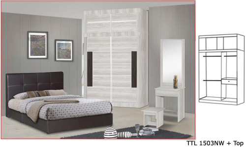 ![]() TTL 1503NW + Top (5' x 8') Queen - H42" x D79" x W60" Dresser Table w/ Stool - H65" x D16" x W18" Wardrobe - H96" x D21" x W59" RM 2,009 Set |
