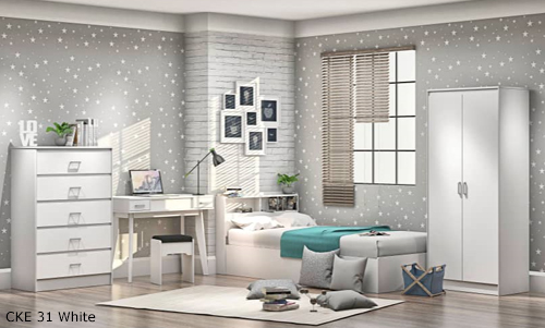 ![]() CKE 31 White. Single Bed - H760 x D980 x W2065MM RM 499 Chest of Drawers - H1200 x D400 x W800MM RM 489 Dresser - H750 x D450 x W1000MM RM 489 Wardrobe - H1680 x D430 x W765MM RM 499 |