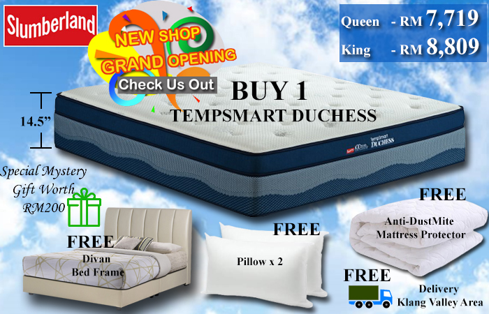 SLUMBERLAND BUY 1 GET 6 GOODIES FREE BUY 1 SLUMBERLAND TEMPSMART QUEEN OR KING SIZE, YOU WILL GET 6 GOODIES FREE - 1 FREE DIVAN BED FRAME - 2 PILLOWS - 1 ANTI-DUSTMITE MATTRESS PROTECTOR - 1 FREE DELIVERY - KLANG VALLEY ONLY - Together we also have a "SURPRISE MYSTERY GIFT" FOR YOU HURRY! PROMOTION ENDS ENDS DEC 31, 2025 Kindly contact 017 9021133 for more info |