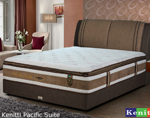 Kenitti Pacific Suite * Kenitti Individual Barrel Shape Pocket Spring System * Luxury imported knitted ticking with soft touch treatment * High Resilient Nasa Technology Visco Elastic Memory Foam * High Resilient Polyethylene Foam * Non Flip with Luxurious Quilted Pillow Top * Polyester Needle Punched Felt Pad * High density foam encasement with extra edge support * 14" Top to bottom * 12 years warranty Single - RM 2,129 Super Single - RM 2,529 Queen - RM 2,969 King - RM 3,569 |