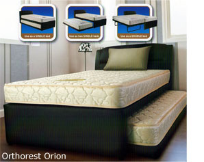 ![]() Dunlopillo Orion * Use as a single bed or two single beds or double bed * Durable nylon rollers for easy slide out. Long lasting * Cut out handles beneath bed base for handy lifting * Spring leg stabiliser automatically pops up for regular height * Locking mechanism for extra safety * Solid platform top bed base for a firmer surface * High grade mattress for excellent support and comfort |