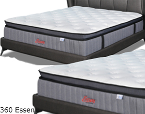 360 Essen* Thickness : 13" * Spring : I-Pocketted * Comfort Layer : E-Latex Pillow Top * Comfort Fabric : Neutrotech Fabric * Bridge Layer : Coconut Fibre * Edge Support : Enhanced Single : Super Single : Queen : King : |