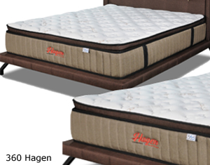 360 Hagen* Thickness : 12" * Spring : I-Pocketted * Comfort Layer : E-Latex Pillow Top * Comfort Fabric : Organic Cotton * Bridge Layer : Coconut Fibre * Edge Support : Enhanced Single : Super Single : Queen : King : |