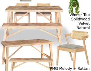 ![]() PMG Melody + Rattan Melody T5010 Table - H760 x D850 x W1500MM RM 1,359 Melody T5020 Table - H760 x D900 x W1800MM RM 1,469 Melody BC5010 Bench - H450 x D380 x W1400MM RM 1,089 Melody BC5020 Bench - H450 x D380 x W1700MM RM 1,259 Rattan C9880N Chair - H740 x D460 x W510MM RM 339 each |