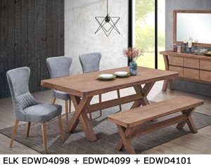 ![]() ELK EDWD4250 + 4251 + 3656. Table - H750 x W900 x L1800MM RM 2,199 Bench - H450 x W380 x L1500MM RM 1,099 Chair - H840 x D570 x W430MM RM 399 each |
