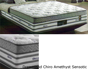 Dreamland Chiro Amethyst Sensotic * Miracoil (TM) - the world's most advanced spring system * Sensotic yarn to relieve body tension * 50% more coil in the center zone for comfort & back care * 100% natural latex * 10 years Warranty * Feel : Soft * Thickness : 13" Single Super Single Queen King |