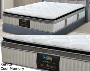 Kenitti Cool Memory - 13" * Pocket Spring System * Cool Silk Fabric * Luxurious Visco Elastic Memry Foam * High Quality PU Foam * Non Flip with Luxurious Quilted Euro Top & Pillow Top * High Density Foam Encasement * Polyester Needle Punched Felt Pad * Top to Bottom 13" * Firmness - Medium Soft Single RM 5,150 Super Single RM 6,000 Queen RM 7,150 King RM 8,550 |